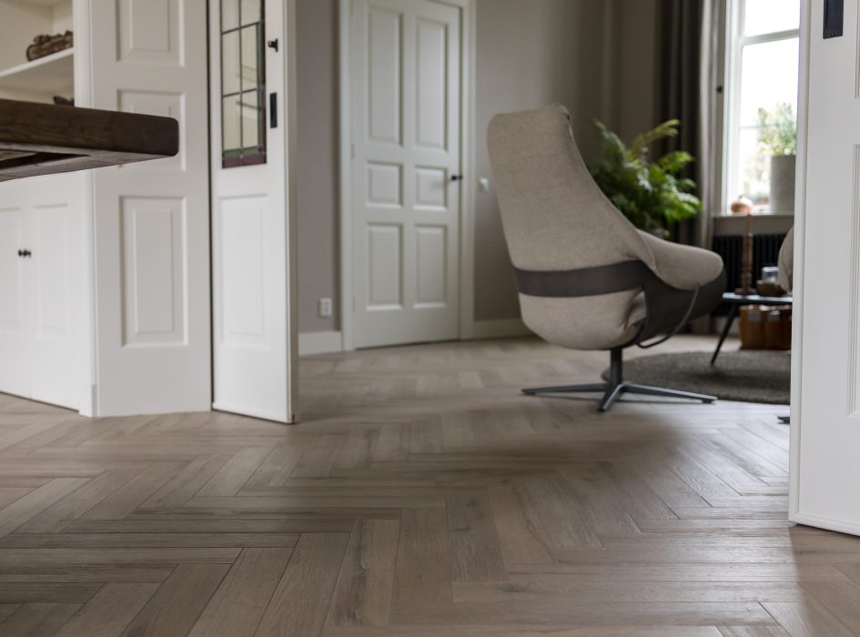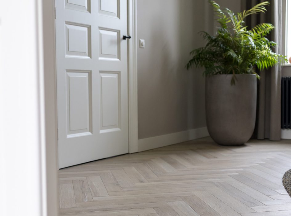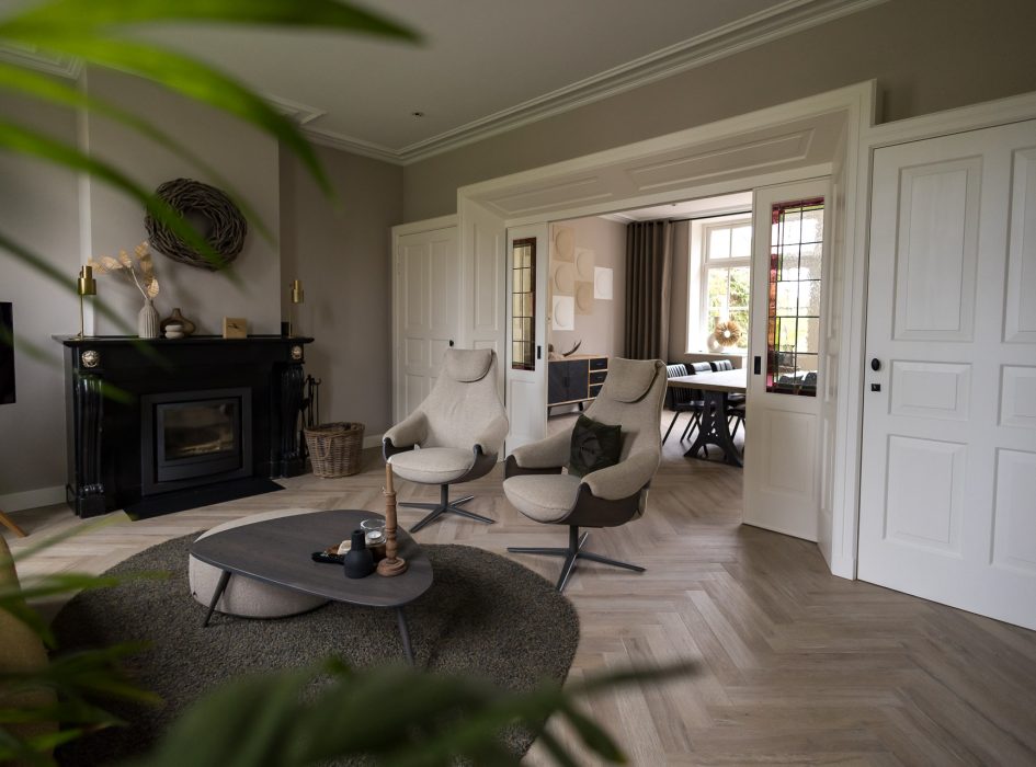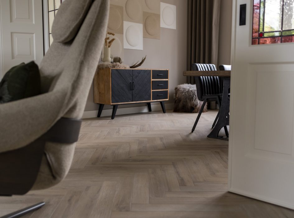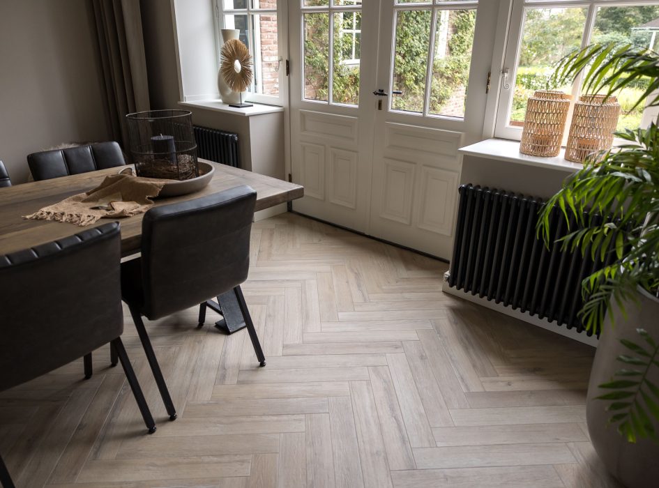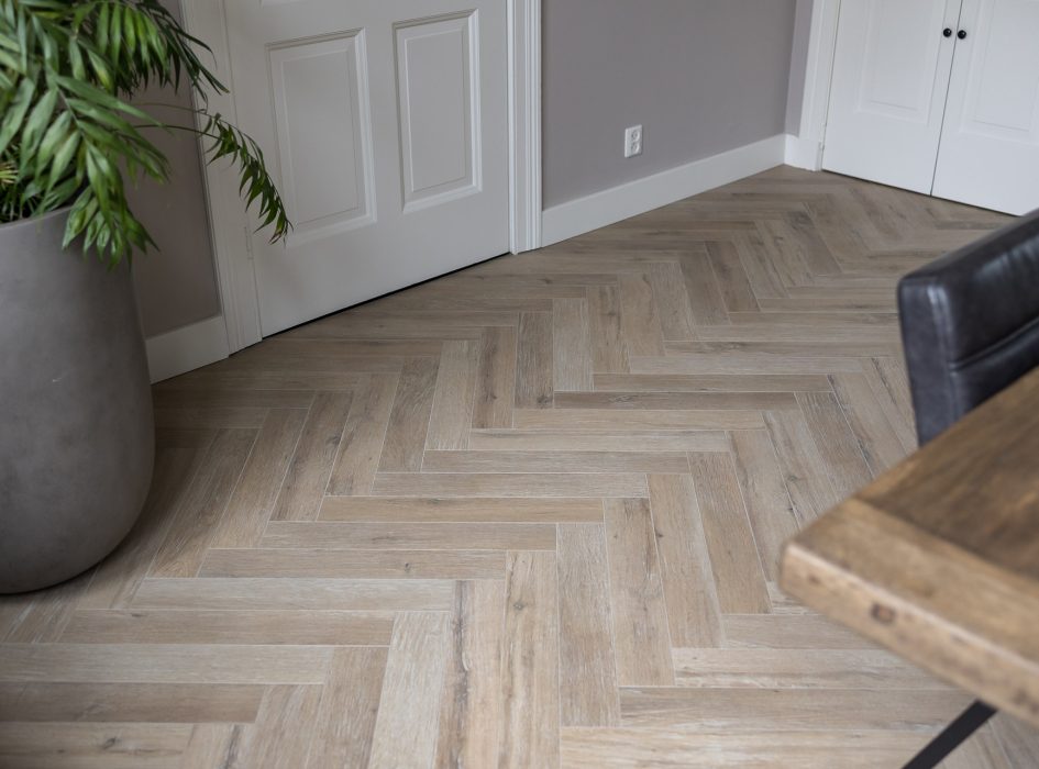 In deze woonkamer hebben we een prachtige visgraat vloer gelegd met houtlook tegels. Deze vloer combineert de warme uitstraling van hout met de praktische voordelen van keramiek: slijtvast, onderhoudsvriendelijk en geschikt voor vloerverwarming.
