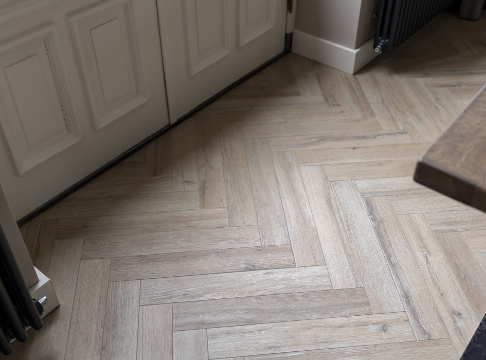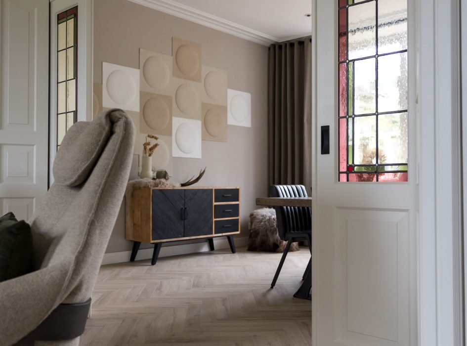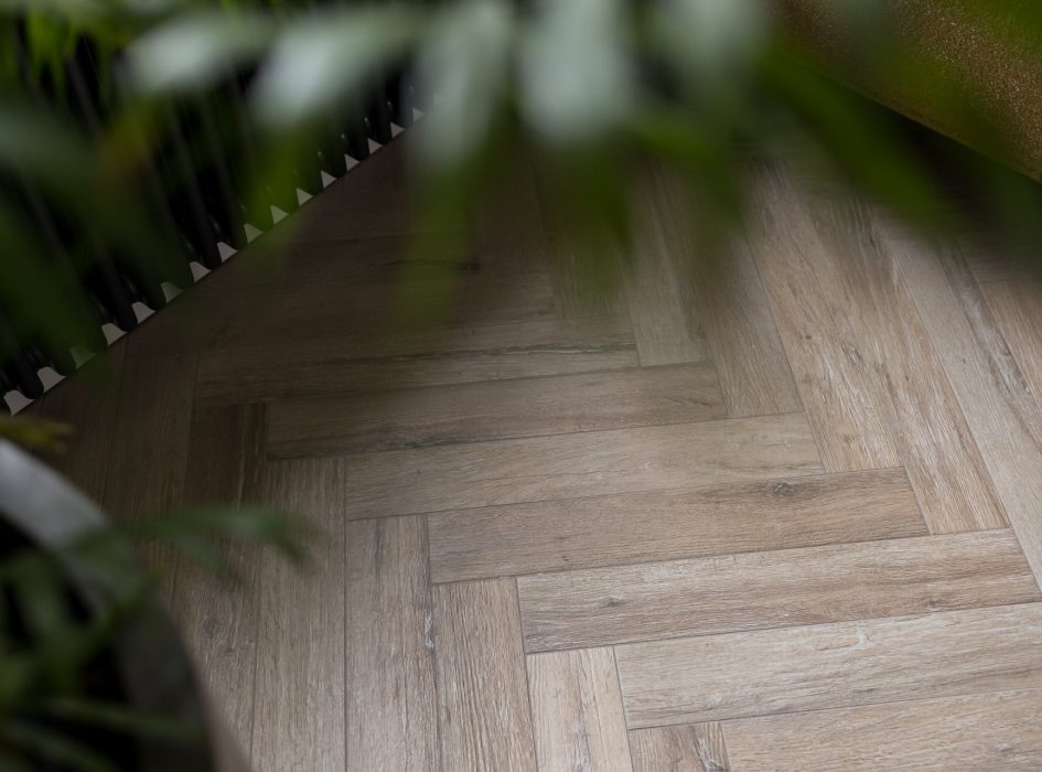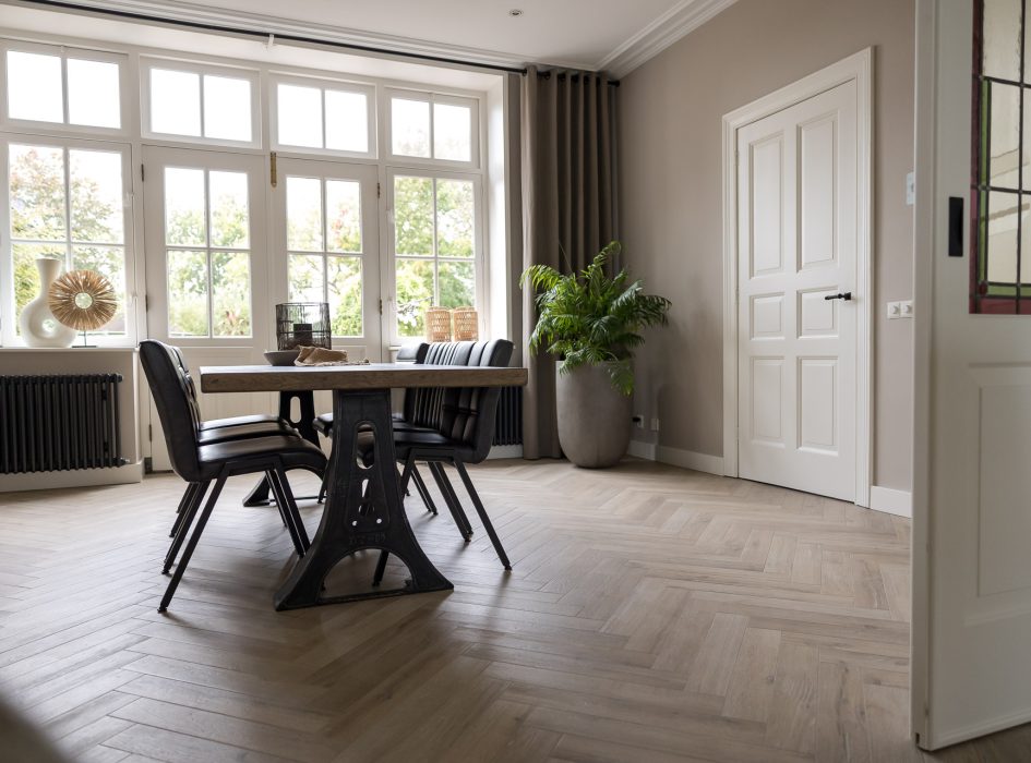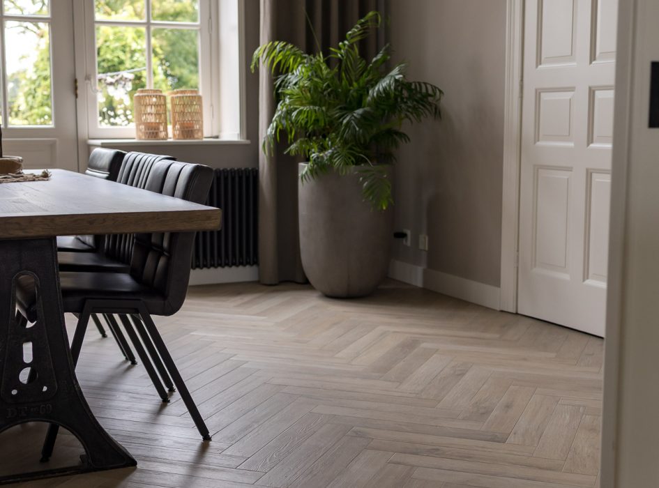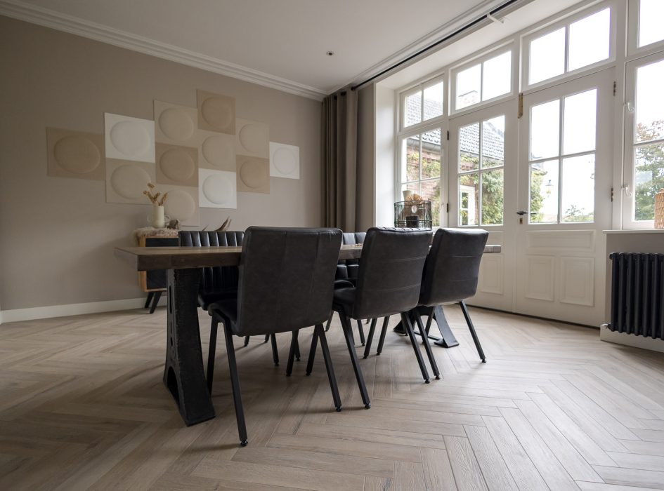 In deze woonkamer hebben we een prachtige visgraat vloer gelegd met houtlook tegels. Deze vloer combineert de warme uitstraling van hout met de praktische voordelen van keramiek: slijtvast, onderhoudsvriendelijk en geschikt voor vloerverwarming.